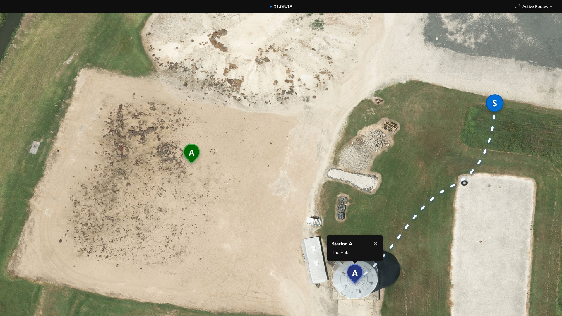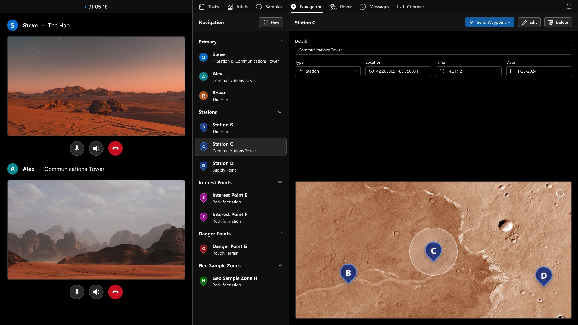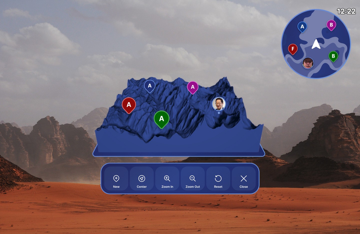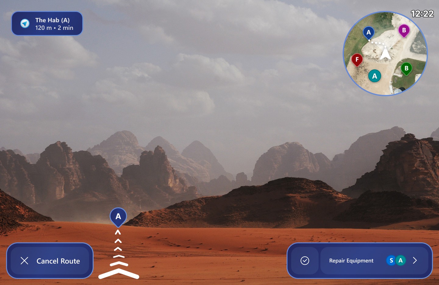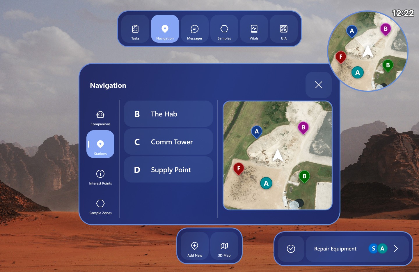 AR: The navigation screen allows the astronaut to select a waypoint and begin navigation. A large map is also featured, providing the user awareness of nearby companions and waypoints. When a waypoint is selected, the app showcases a route preview.