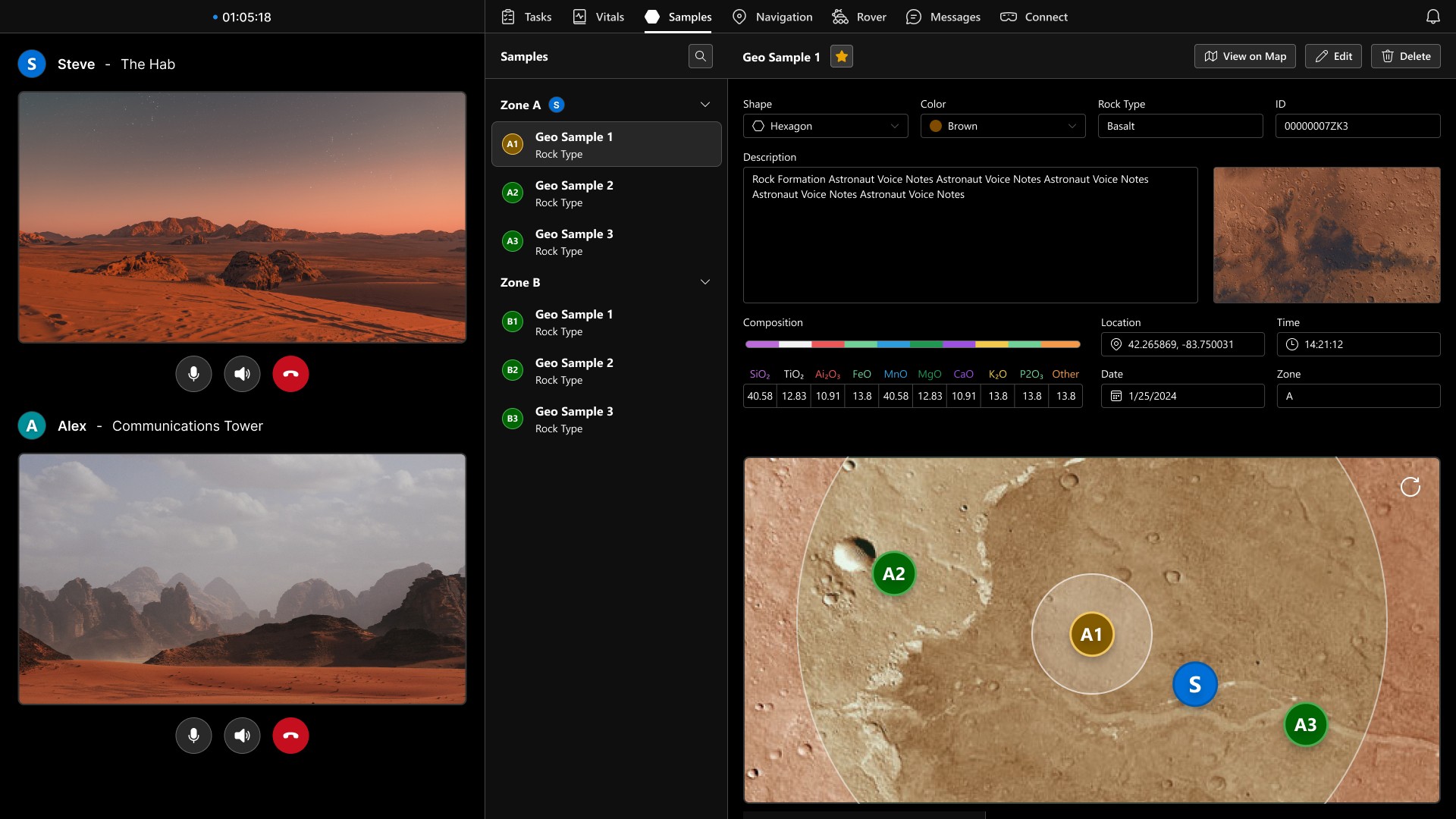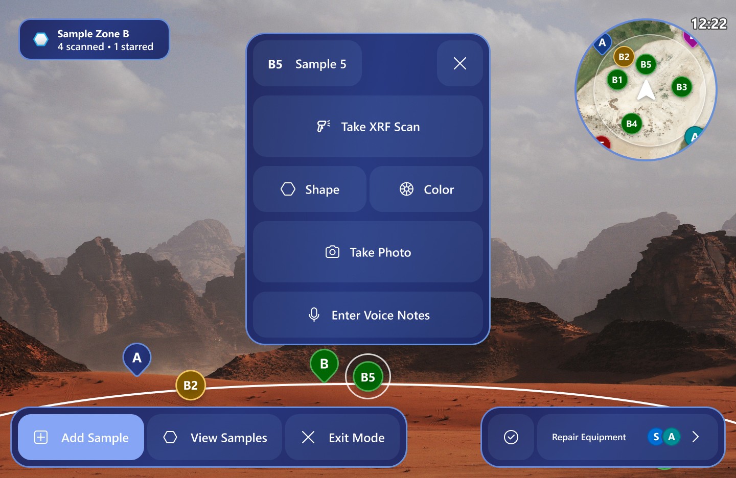 AR: Numbered icons identify rock samples in space and on the mini map. A pop-up menu allows the astronaut to create a new sample and add details. The focused sampling mode view hides the main menu and allows the astronaut to focus on the geological sampling process.