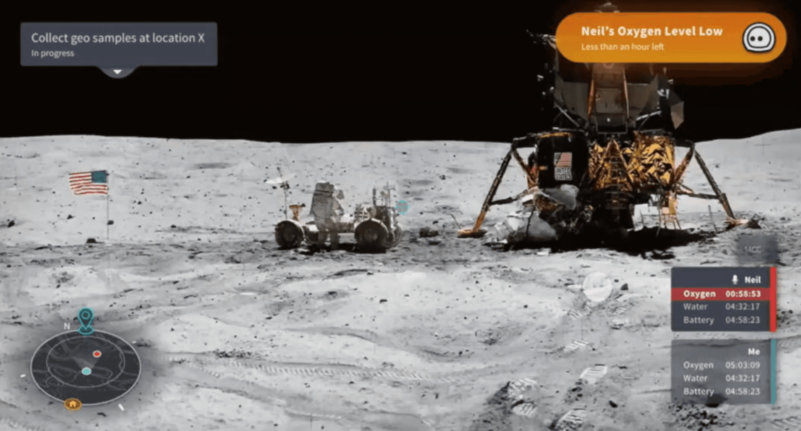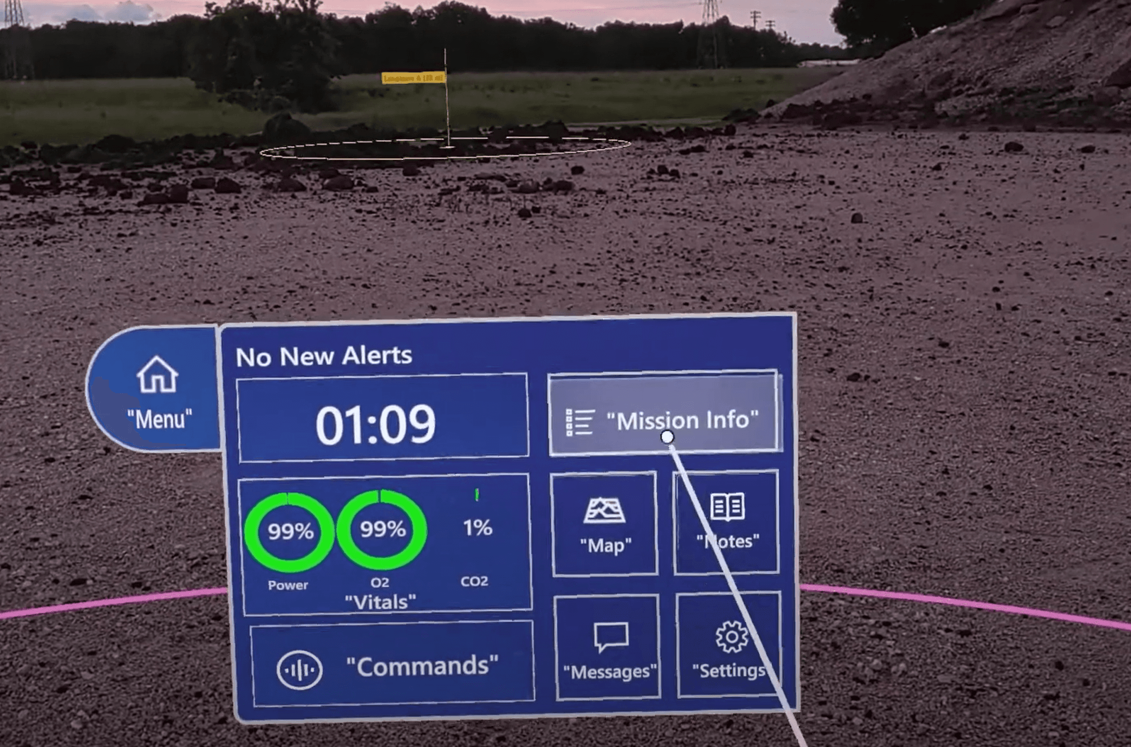 Our augmented reality IRIS application proved very successful helping the design evaluator quickly navigate each step of the mission, which included navigating between waypoints, logging rock samples, and using tools to repair an equipment tower. We also received positive feedback on our mission control center interface, with the NASA evaluators praising the easy-to-use design and large astronaut camera feeds on the display.