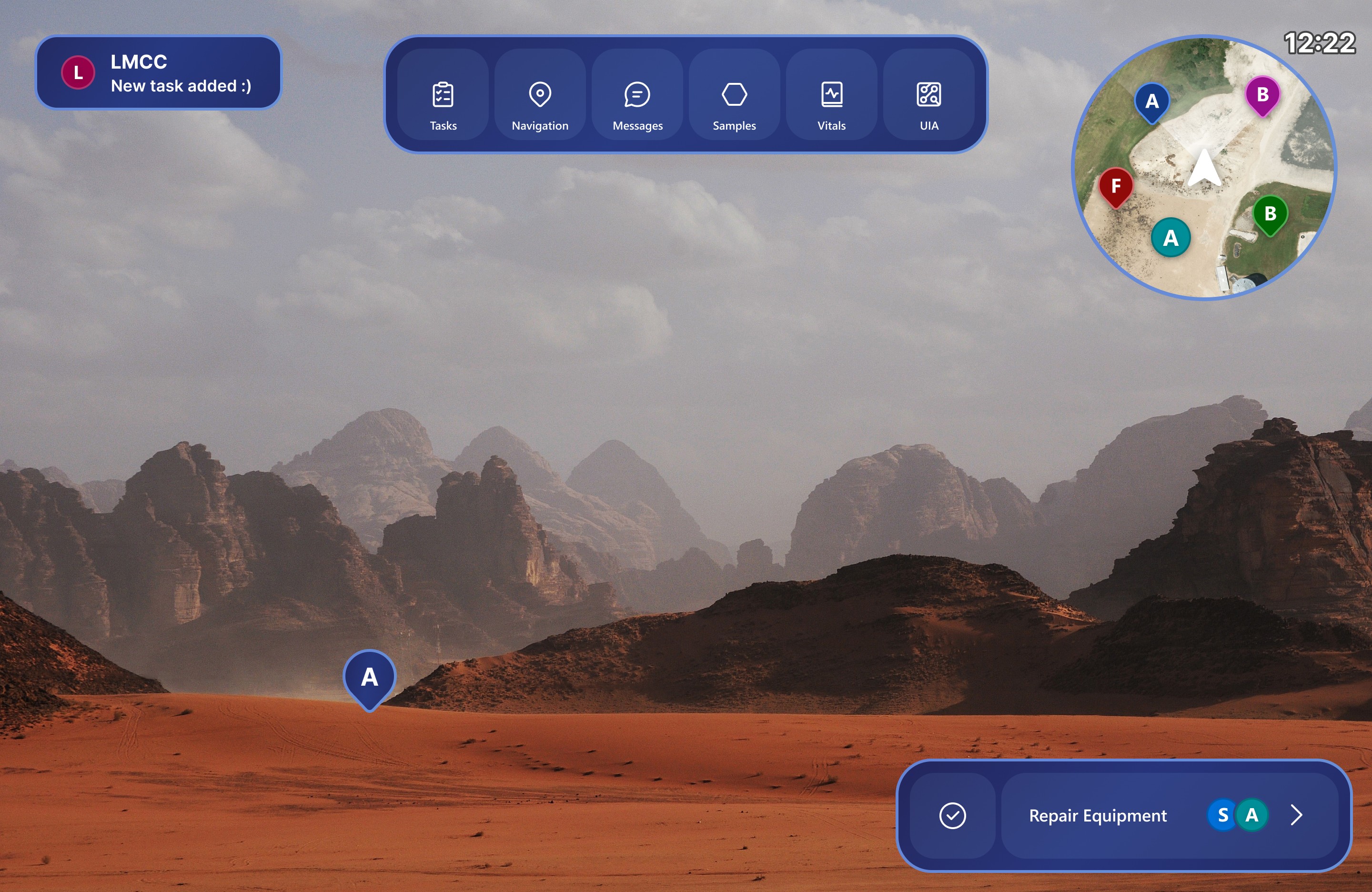 NASA astronauts exploring the Martian surface. The priority is maximizing astronaut safety by providing assistive information and situational awareness. The thin Martian atmosphere allows for thin spacesuit gloves, enabling direct touch interactions. Astronauts are often holding tools or using their hands for tasks. They also prefer to have their view of the surroundings as unobscured by interface elements as possible.