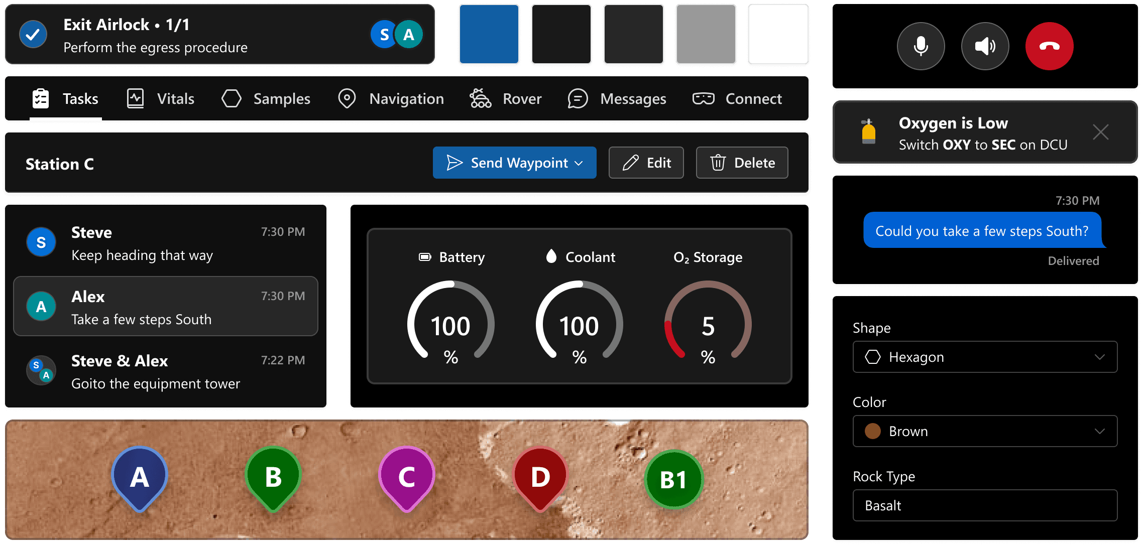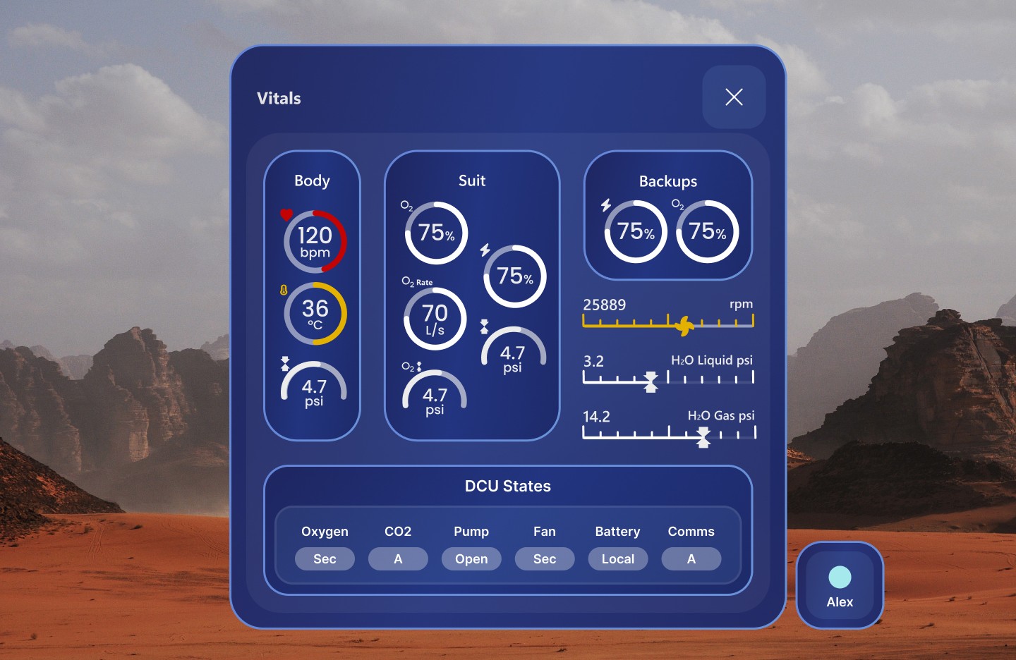 Direct Touch: Allows the astronaut to use their hands to press buttons. Provides a quick, direct, and familiar interaction system. Direct hand control is possible due to the thin Maritan atmosphere allowing for slim-fitting spacesuit gloves. The astronaut user can also use the HoloLen's hand ray system and a pinch gesture to select buttons further away.