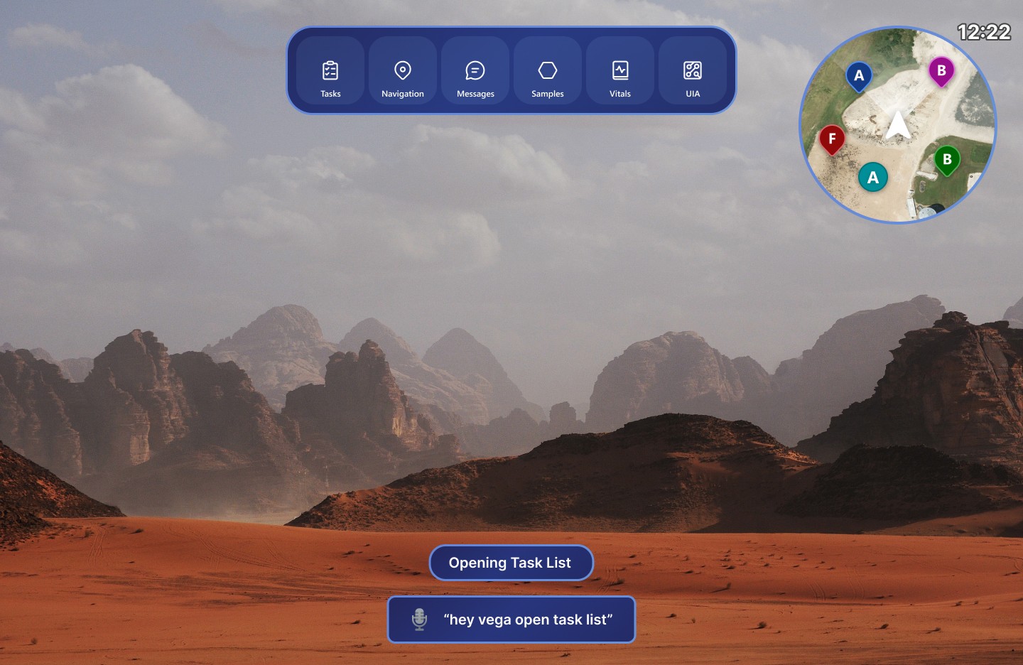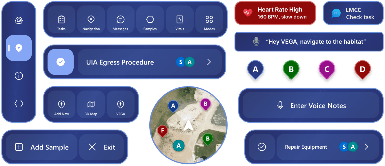 Voice Control: Powered by IRIS's voice assistant VEGA (Voice Entity for Guiding Astronauts). This system is necessary in addition to touch control because astronauts are often holding tools or working with their hands. Further, if the touch tracking system breaks during the mission, the voice assistant serves as a crucial fallback. To assist with usability, every button on the interface has a text label, instructing the user on what to say to select the button. VEGA also accepts complex, multi-step commands, letting the astronaut more quickly accomplish their desired interface actions.