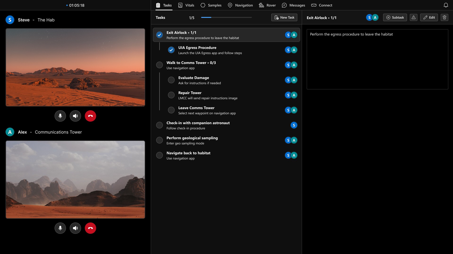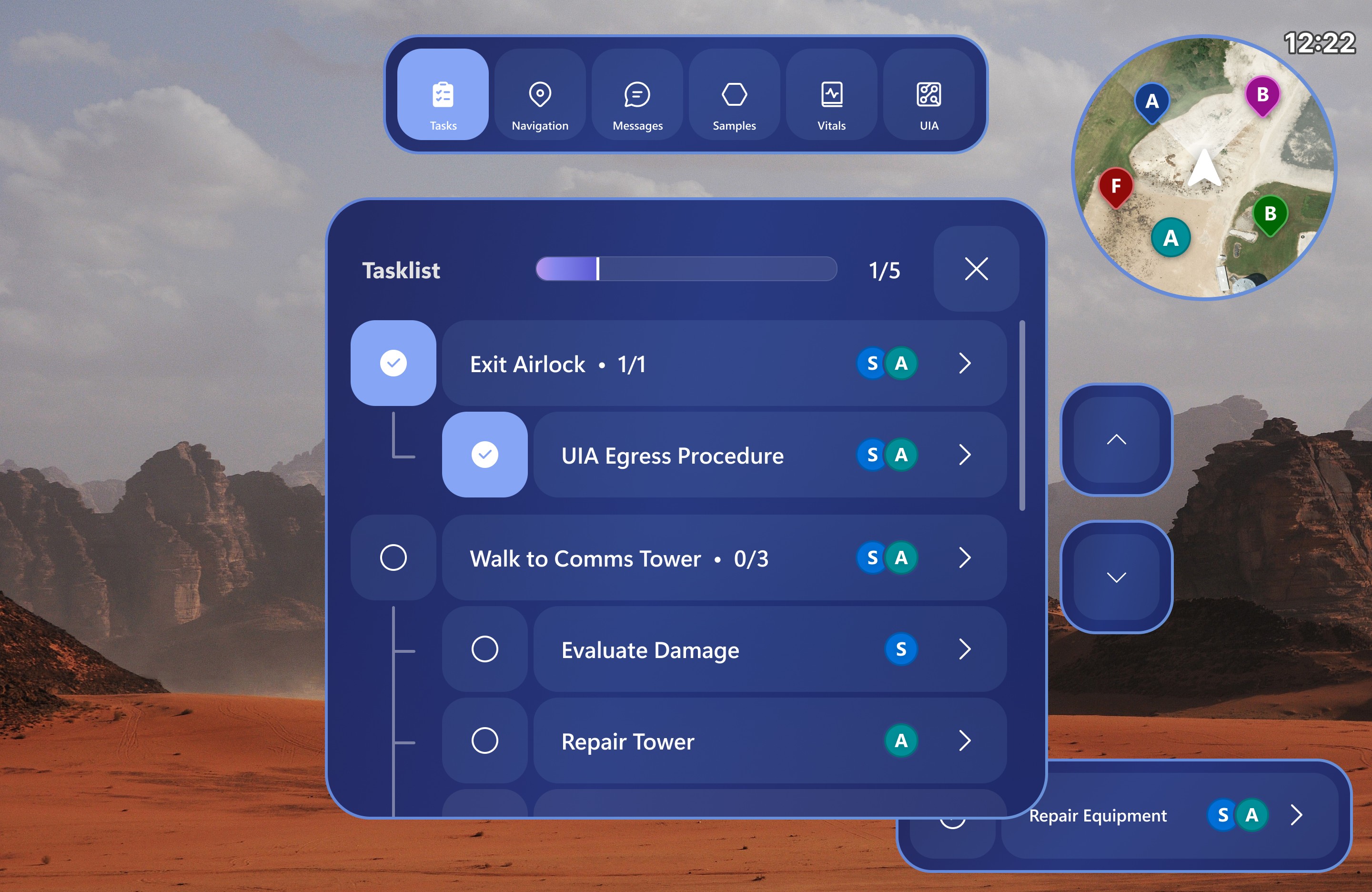 AR: The simple task view was designed to allow the astronaut to scan through all their tasks and subtasks. Selecting any of the task buttons opens a pop-up with the full task description. The progressive disclosure approach was necessary to comply with the HoloLens' large minimum button size requirement and to have the AR experience remain streamlined and focused.