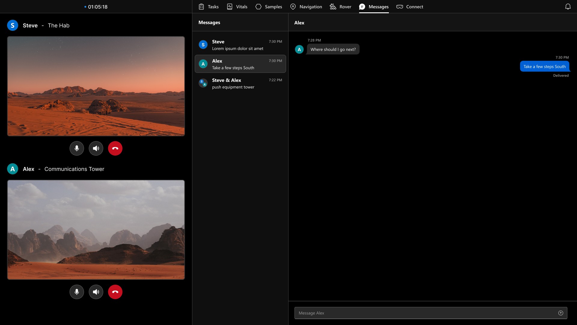 The mission control center utilizes a 2-monitor setup. The left screen's call column persistently displays both astronaut's video feeds and accompanying call controls. The other two-thirds of the screen allows the LMCC operator to monitor and control the astronauts' mission. The LMCC's features can be accessed using the persistent menu at the top of the screen. The tabbed approach helps the user have a focused, full-sized view of each page's content and controls. The right monitor contains a full-sized map, providing the location of all mission assets and active routes.